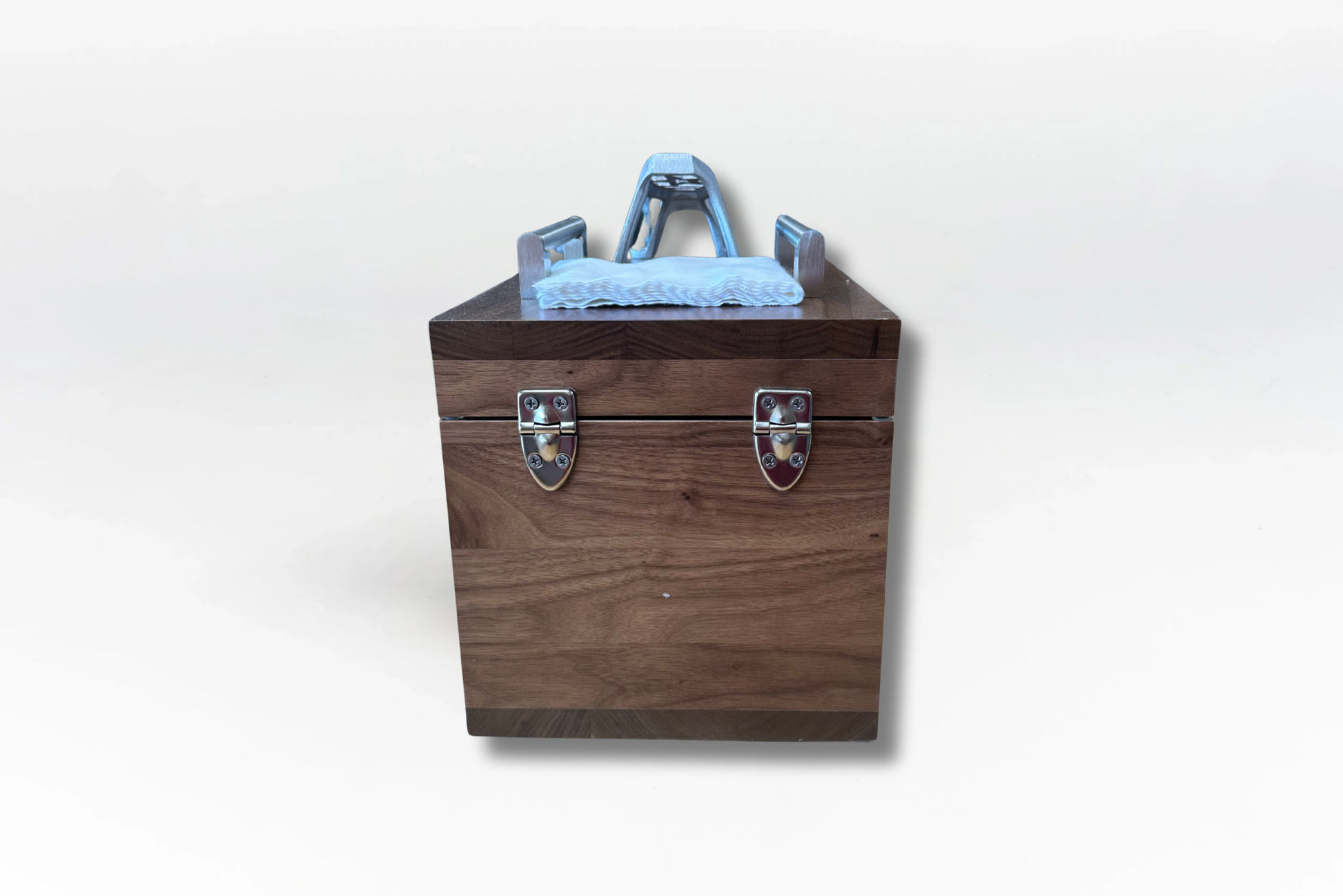 Constructed in the USA from solid walnut or cedar, every box features 45° mitered corners, a solid wood bottom, and premium metal rails and a metal foot for durability and function. Though this design is offered at a lower price point, it maintains the same top-of-the-line craftsmanship and quality you expect from our Deluxe Shine Boxes.