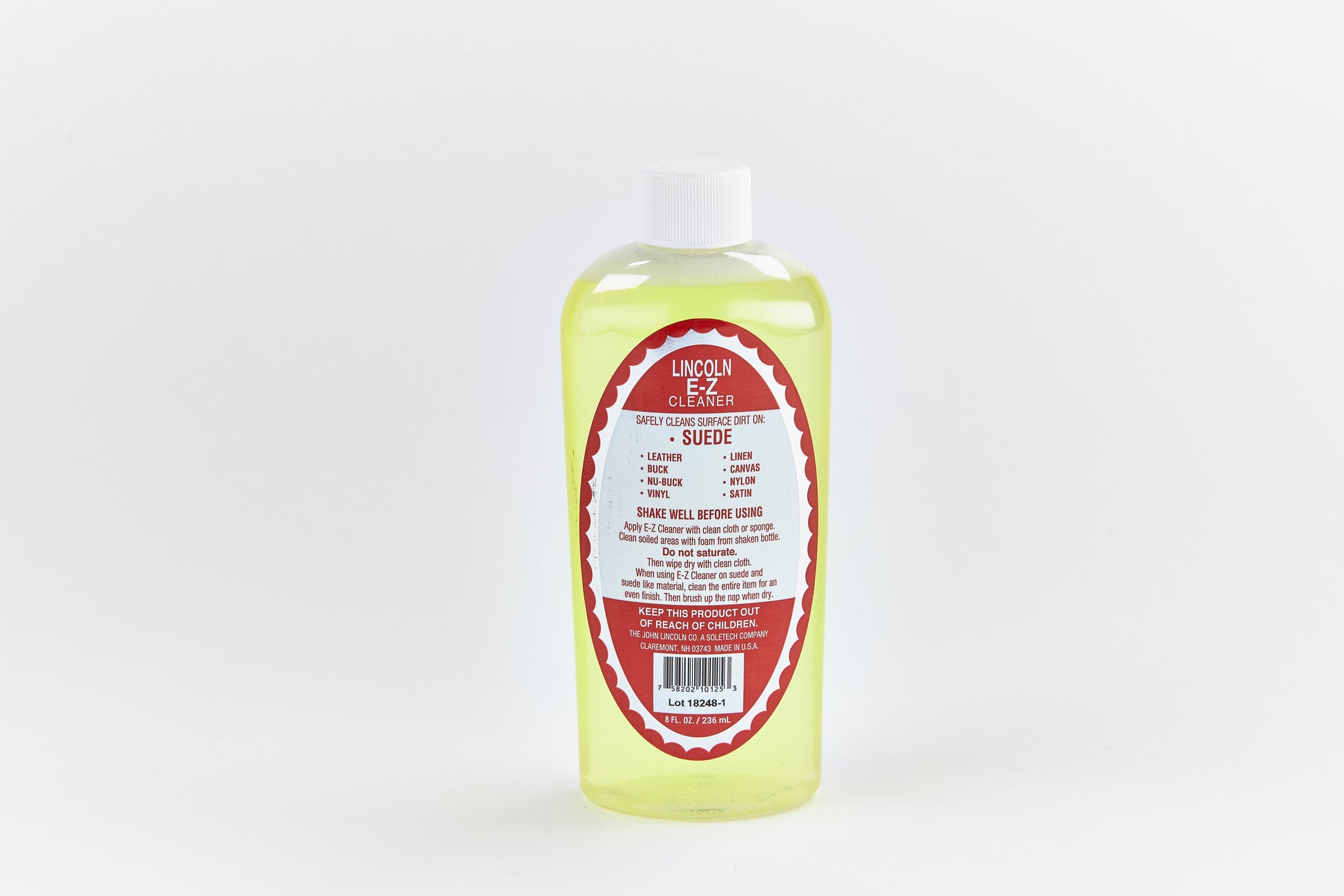 Lincoln E-Z Cleaner is the original easy cleaner for both smooth leathers and suede/ nubuck. Use E-Z Cleaner and a soft brush (a new toothbrush works well) to remove dirt, smudges, and water spots from suede and nubuck shoes. Wipe smooth leather shoes down with E-Z Cleaner to get them cleaned up before you apply Lincoln Shoe Polish to make them shine! Other products on the market make you choose different cleaners for different textures, but E-Z Cleaner is effective on both. It also has a mild scent compared to the harsh spray treatments of some competing products. Don’t forget to try it on leather jacket collars and leather gloves!